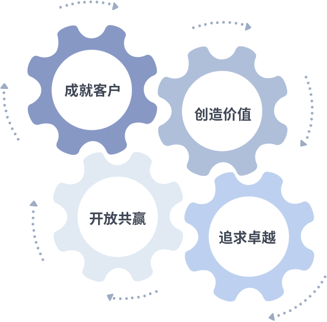 成就客户是一切决策的出发点,创造价值是衡量所有工作的标准,追求卓越是赢博做事做人的态度,开放共赢是赢博的格局也是最终的结果。价值观的齿轮环环相扣,推动着组织里的每个人不断向前。